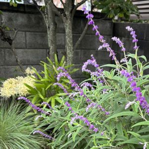 アメジストセージ🌱 小雨の中、倒れながら(笑)咲いています。