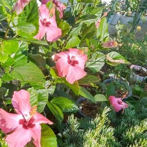 今日のハイビスカスたちの開花の様子は、「オレンジフラミンゴ」、「ポモナ」、古株の「ハイビスカス」(2輪)でした🥰