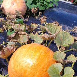 奥に咲いている きょうのお花の百日草と重さ30キロ以上はあるという 巨大かぼちやです