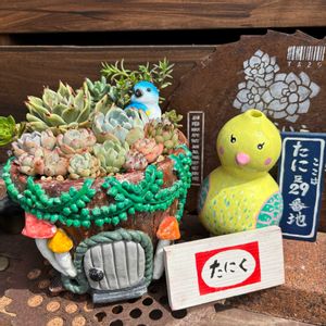 おはようございます🌞 第三作目はひょうたんハウス🍄 ドア開閉可能だよ(*´∀`*)ノヤッホー★ ルビネちゃん増えてきて嬉しい💕 でもって黄色いお花が可愛い🌼🌼 けど場所によってプックリしてる子と細っこい子が… 陽当たり?土?水? どちらにしてもミドリ〜ん💚💦