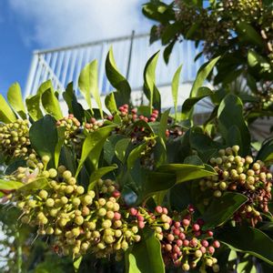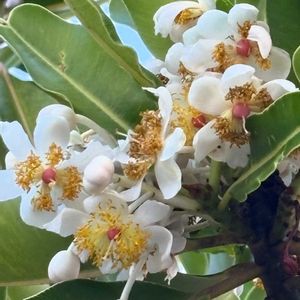 The沖縄の木 テリハボク(照葉木) 冲縄名 ヤラブ/トゥフクギ/ヤラフクギ 別名 ヒイタマナ 高さ20mほどになる高木 沖縄の各島の海岸部に自生 材が堅く木目が美しいことから 家具 装飾材として利用価値が高い また樹皮や種子を薬用に用いる 耐潮性があり 石垣島 宮古島では防潮林 防風林として古くから利用される