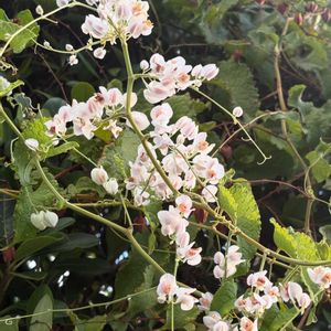 昨日のコウシュンカズラと仲良く咲いてました 学名 Antigonon leptopus 和名 アサヒカズラ(朝日葛) ニトベカズラ(新渡戸葛) 別名 クイーン・ネックレス 科名 タデ科 メキシコ原産の非耐寒性常緑つる植物 ピンク色の可愛らしい萼が花に見える 地下に塊根があり食用になる 花に蜜が多くミツバチなどの蜜源にもなる どうりでたくさんの蜂が群がってました ニトベカズラは 台湾総督府殖産局長を務めた 新渡戸稲造氏を記念して名付けられたそうです