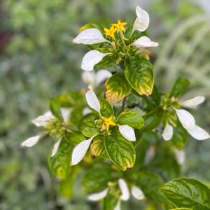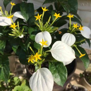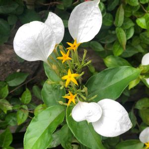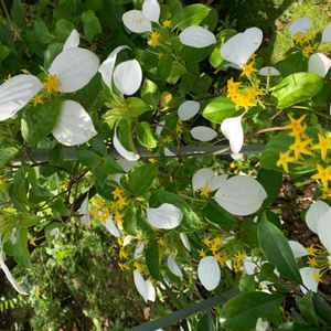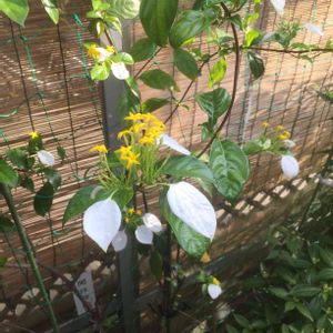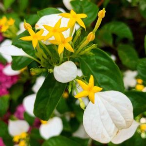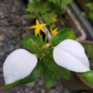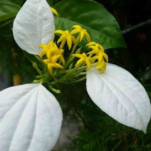 コンロンカ(Mussaenda)の花🌼コンロンカは、熱帯原産の常緑低木です。🌸「ハンカチの花」とも呼ばれるコンロンカは、花びらのように見える白い部分は実はがく片で、本当の花は、枝の先端で黄色で小さく群がって咲きます。花よりもがく片が目立つのが特徴植物です。🌸🌿🌼