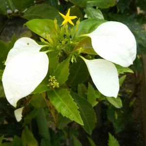 【崑崙花】*宜野湾大謝名 萼がお花に見えます。白と橙色とグリーンのコントラストがきれいです。 *アカネ科 *萼…スノーホワイト *花…橙色