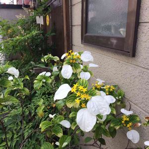 復活コンロンカ🌱 咲きました笑 他にも花芽出てきそうですが 白いハンカチはまだまだです。 葉が黄色くなってきた枝もあるので早めの剪定と植え替えが必要っぽいです。 鉢が大きいのでちょっと大仕事ですね~2週間以内かな?