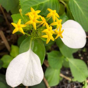 お友達がお出かけ先で見かけた花。 見たことない🤩 上の2枚の葉っぱだけが白い! なんの花か教えてください🙇♀️