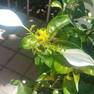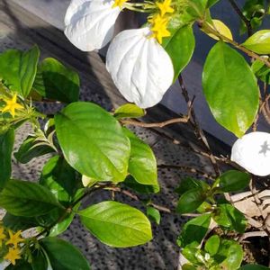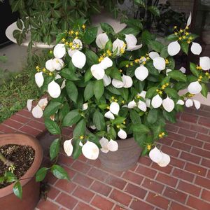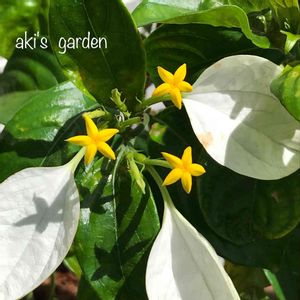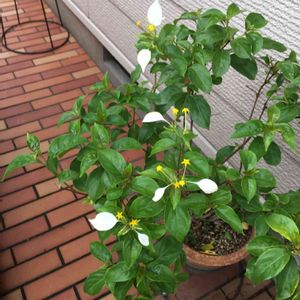 コンロンカ。 ジリジリ太陽ですぐに土がカラカラになってしまい、白いがく片がかなり茶色くなってしまいました。 茶色くなったのはハサミで✂️ましたが、黄色い小さな花も少し落ちてきたので、日差し強な場所から、屋内の窓辺にひっこめてみました。 そしたら黄色い花がポロポロ落ちてきたので、結局ベランダの半日陰に置きました。 多少マシになった気がします。 がんばれ(*´◒`*)