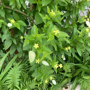 コンロンカ(崑崙花)🌼 アカネ科 コンロンカ属 別名 ハンカチの花 先日、GSの投稿で教えていただいた コンロンカ🌼 今日、近所をお散歩してたら、お庭にたくさんのお花を育てているお宅で、本物を発見したので、見せていただきました。 ちょうど、水やりをしていた女性が、 『名前は忘れたけど、いっぱい増えちゃって』と声をかけてくれて、 『私も最近知ったのですけど、コンロンカ ハンカチの花というそうですよ。』 『あぁハンカチの花ネ』と嬉しそうでした
