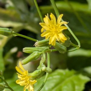 駅前のコンクリートボックスの木の植込みの間から見かけないくさが生えている。開いていないので、また見に来よう。2日後には開いていて、触るととても柔らかく、根生葉が丸くて、ヒューっとくきが延びて黄色いキク科と思われるはなが咲いている。 違うように見えるけれどオニタビラコかと、もう一度調べると、葉が違う。 これはイワニガナ別名ジシバリ キク科 ニガナ属 かと思いますがどうですか? ①②本日撮影 ③8月28日撮影