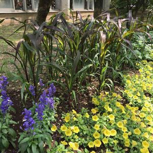 カネコ種苗群馬フラワーパークです❣️ この黒い葉っぱのトウモロコシみたいなの、なんていうお名前なんでしょ 花はどんなのが咲くんだろ👀