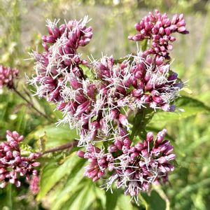 サワフジバカマ(沢藤袴) 🏷️今日のお花 庭に咲き始めたばかりです。 在来種のフジバカマは見たことがなく、サワヒヨドリとの交雑種だと知ったのはGSを始めてからです。 薄紅色の花の色も紫の茎も確かにサワヒヨドリソックリです。 特に、雨の日なんかにフンワリ香る葉っぱの香りは本物のフジバカマとおんなじなのかな〜🎶
