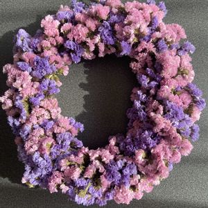 スターチスのリース。初めて作った。かわいい🥰 難しいんだろうな〜と思ってたけどシロツメクサの花冠作れる人は余裕だわ😙