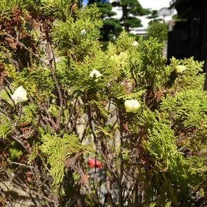 よく見かける木🌲 白いのは花?実? 不思議な形… 🍀追記 「カイヅカイブキ」というコニファーでした。 みーさんに教えて頂きました❤ ありがとうございました😌⤵︎ 白いのは「球果」 まつぼっくりも球果