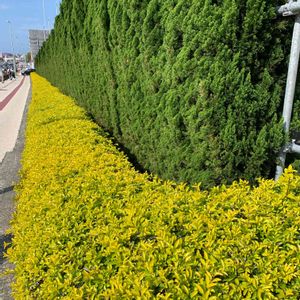セカンドハウスに向かう途中、食料品 買い出しで立ち寄るスーパーの植え込みが 綺麗。タイワンレンギョとカイヅカイブキ のコントラストが絶妙だ。
