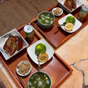 夕ご飯 うなぎ丼 冷抹茶 搾菜 ゴールドキーウィ🥝 早稲蜜柑 野菜と果物のスムージー 野菜料理が無い時気休めに飲んで居ます。 願わくば甘く無い方が良い、かなりの果物の甘さが有ります。