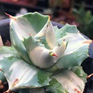 アガベの季節ですね🌺 雷神さまは2つ居るんですが、王妃雷神さまは初めて💕 小ぶりだけど美しい😍 お店の人から「これは三色入ってて珍しいんよ」と言われ👀三色⁈白と緑と…クリーム色かな?わかんないけど気に入ったので購入💓 私的には高級品🤩