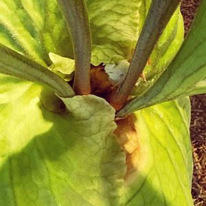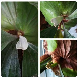 真正面から葉焼けキッチャ。 焼けたとこ、質感そのままでチョコレート細工みたいだったけど、いよいよ水分抜けてカリカリしてきました。 新葉は左胞子葉✊✨