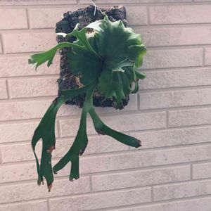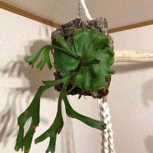 白絹病疑惑の方がこちらです。 我が家のビカクシダの中では一番高いです😇 ベンレートをバシャバシャかけたせいか、新胞子葉が上にぴーんと伸びていたのに、ちょっと疲れたように開いてきました。 石灰をまぶすか、考え中です。。
