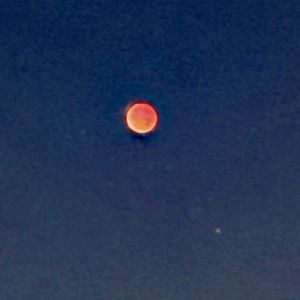 孫と見る 皆既月食 赤い月 地球の影だね〜 神秘的だね〜、と 夜中の2時から3時まで、中学生の孫と一緒に、ベランダから月を眺めました。 だんだんと地球の影が月を覆いはじめ、2時30分頃には覆い尽くし、満月は神秘的な赤い月となりました。 すだく虫の音を聴きながら、孫と赤い月を眺められるなんて、幸せな時間でした。