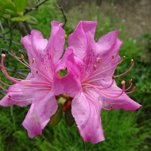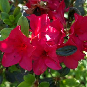 《空は石楠花色にたそがれる》 石楠花の花が、たそがれ時の夕焼けを想わせる、鮮やかな耀きを魅せています🎶☺️ 江間章子作詞・中田喜直作曲の「夏の思い出」で《石楠花色に たそがれる はるかな尾瀬 遠い空》 と歌われています🎶 写真の石楠花は、西洋系石楠花で、日本系石楠花には葉の裏に細かい毛が生えています。 花言葉は 高い厳しいところでも 咲くことから 威厳・荘厳 葉に有毒成分を含んで いることから 警戒・危険