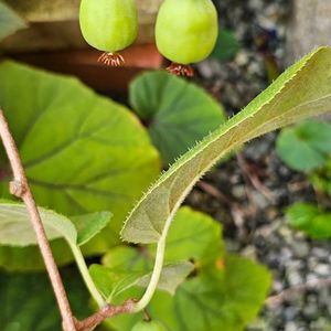 ①💚親ツバキ (藪椿) 実が成って色付いてきました♥ 皮が茶色くなってポッカリ割れたら黒い種がこぼれます♪ お散歩ちゃん 「そちらはどお〜?😉」 子ツバキちゃんに声かけてます ②子ツバキ 種から育って実ができるほどに 成長してきました💚🎶 お散歩ちゃん 「うん、うん、大丈夫!! 綺麗な緑色で〜す✌」 (*˘︶˘*).。.:*♡•*¨*•.¸¸♬︎ 2枚投稿です 横へスワイプお願いしますね