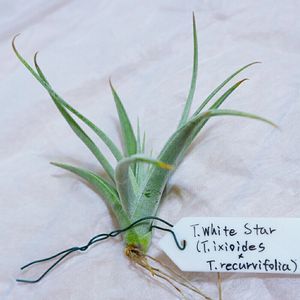 Tillandsia 'White Star' ixioides x recurvifolia ホワイトスター 放射状に広がる銀葉に因んだネーミングのようですが、本種の見所は美しい花にあります。 アノプロ系の花では一番好きな配色かもしれません。ただし発色は個体差が大きいようです。 耐寒性は-8℃、Zone 8b程度。