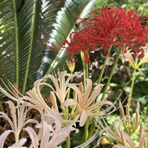 我が家のヒガンバナ。❤️🤍🌿ソテツの元で。💙朝顔さんと一緒に 赤も咲き出しました😊 4️⃣つぼみの頃のツンツン⬆️⬆️⬆️