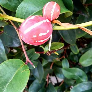 生垣の赤に白いしましまと緑に白いしましまの木の実は何という名前の植物でしょう?