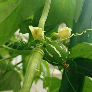 おはようございます☀ 先日やっと花が咲いて喜んでるいたら雄花と雌花があり雌花に実がなるとYUMIKOさんに教えてもらいました。先日のお花は雄花だったようで⤵️ またまた諦めかけた今朝また数個の花が咲いていてなんと!ぷっくりしたものを👀 いや〜かわいい💕小さいのに縞模様もある〜〜 大きくな〜〜れ😊💕