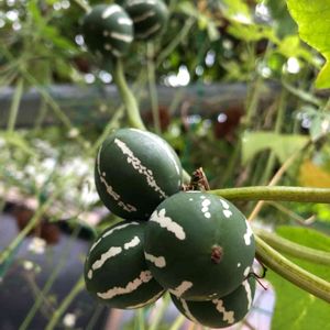 沖縄スズメウリの実。夏の猛暑に負けそうでしたが白い縞模様が入りました。も少ししたら真っ赤に色づきますよ。