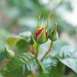 アレゴリー 深みと華やかさを合わせ持ったクリムゾンレッドのロゼット咲き。ダマスク系の強香。明るい緑色の葉と濃いクリムゾンの花色とのコントラストが個性を引き立てる。春から秋まで繰り返しよく咲く。四季咲き性。