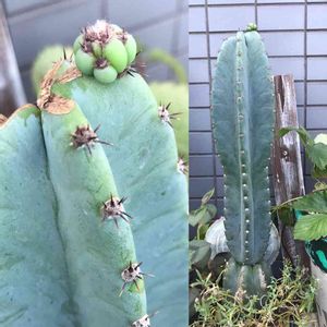 ハシラサボテン🌵その後…。 昨年9月に新築祝いとして我が家に 来た子です。 内心今迄サボテンさん🌵 育てた事なくて😅駄目にしたら頂いた方に 申し訳ないしどうしようと取り扱いに戸惑いました🌵 秋に来たので寒さで溶かさない様に 玄関の中で過ごしてもらい 春の温かい日差しになってから 外で管理していました。 最近何か頭の先がとんがり始めた様な… 左は昨年9月25日 右は今日6月6日に写メとると やはり明らかに頭の形が違う事に 気付きました。 いつの間に??とんがってる所は 色が違いますそこの部分が伸びた部分 の様です。 枯れてるか生きてるかが解らなかったけど生きて成長してくれていてありがとう😊 ググってみたら花が咲くとありました。 お花見れるように頑張ってお世話したいと思います。🌸