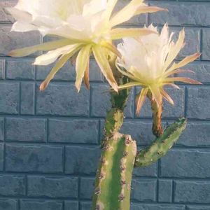 ハシラサボテンのお花🌼 今朝見れました!!間に合った! ちょっと閉じきてるけど やっぱり咲いてた ガラス越しになってしまったけど本当に綺麗でした!