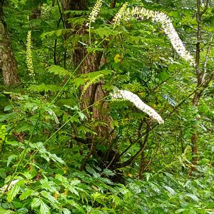 サラシナショウマ(晒菜升麻) キンポウゲ科サラシナショウマ属の 多年草 別名 ヤサイショウマ(野菜升麻) サラシナ(晒し菜) 林の中、白いブラシのような花穂が、所々で、目立っていました。 花穂は、長いものは30㎝くらいの長さがあって、小花が、びっしりついて、弓状にしなっていました。 花は、両性花と雄花がついて、 開くと間もなく、花弁と萼片は落ちて、白い雄しべが残るそうで、長く楽しめそうです。 升麻は、根茎を乾燥させた生薬名で、 若菜を茹でて、水に晒して食べたことから、サラシナショウマと名前がついたそうです。