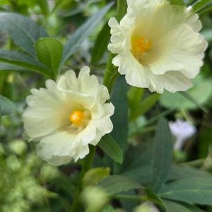 おはようございます👋😃☀️ ハイビスカスローゼル(白玉) 今朝は2輪並んで咲いてました❇️ 白玉と赤玉の葉は形が違って、両方共に手のひらみたいな形ですが、白玉の方が細く赤玉の方が丸みのある葉なんですね😊 赤玉の花💠はまだ小さな蕾で咲く迄もう少し時間が掛かりそうです😃💦