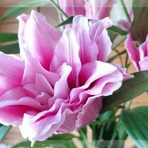 オリエンタルリリー ピンクの八重咲き 実家のお仏壇にお供えする前に 玄関で📷✉を! お花の名前を聞くのを忘れました(*^.^*)