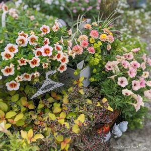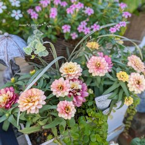 ジニュアンス ダブルピーチテラコッタ🍑 先週突如ブレークした 秋ジニアちゃん 1株からこんなにカラーが 楽しめちゃう可愛い子😍 バコパが可愛いでしょ🫢 葉っぱがシャリシャリになる前に 楽しまなきゃ🫢