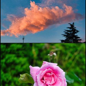ピンクのバラと朝焼けの雲 嵐の前の静けさでしょうか? 朝焼けの雲 マナぬるい風です 台風の被害大きくならないと良いですが