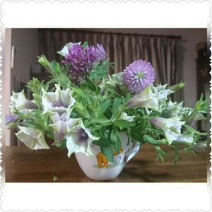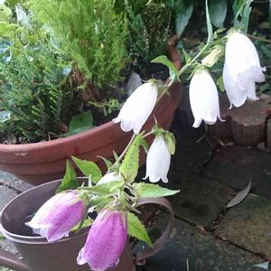 ホタルブクロ 🐶の散歩が、最近は家から半径100メートルがやっとになって来て…。 庭先でお水をあげてる方に、きれいですねと声をかけたら、「勝手に生えてきたのよ、どうぞ」と切ってくれました🤗 ❔勝手に生えるのか〰️🤣 🐶のボールに付き合う間、この中へ🎵