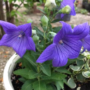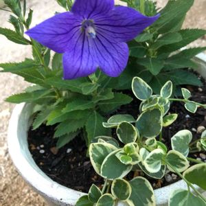 雨の合間に。宿根草のキキョウが、今だ❗と言わんばかりに🤗 去年は、葉っぱ🌿にびっしりのアブラムシに悩まされて、消毒やら、切り戻しやら(^^;)(;^^)。今年は、大丈夫みたい💚 三年目のプラ鉢は、流石に窮屈そう…、植え替え時期ですね😱