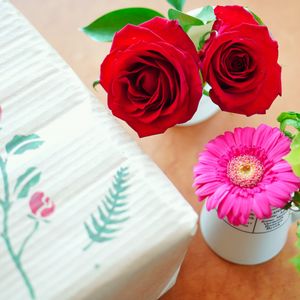 フラワーアレンジメント教室で短くカットしすぎたお花も花瓶に飾りました。 薔薇のステンシルのパッケージと一緒に🌹