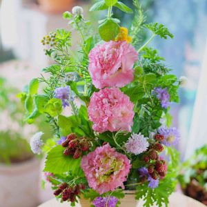2回目のフラワーレッスンの作品。 ローズマリー、ロースゼラニウム、ミント、シロタエギク、センニチコウ…おうちでも育てている植物が多数。 おうちにもある植物でこんなに華やかになってびっくり‼️ シロタエギクは、花が咲いたらビヨーンって間延びするのが嫌で、いつも花が咲かないようにカットしていたから、シロタエギクのお花を飾るって発想が斬新でした。