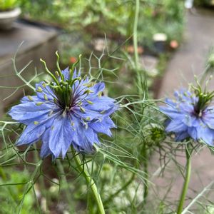 念願の青のニゲラが咲きました。 いままで白しかなくてご近所でタネをもらい咲かすことができました。 メルカリで買ったこともありますが、今回が初の成功です。