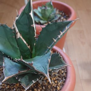 ウチのアガベ番号167番 「チタノタ FO-076」さん♪ FO-076としてお迎えしたのですが、 この子の親…、 うーーーん。。。 名前なんていったかな? うーーーん(>_<) 緑の大葉で 横刺は無くて 白いマージン形成するタイプで 先刺が太くて長いタイプ その先刺の元がマージンと重なり豪快に白いのが1番の特徴かも そんな葉がぱっかーんとひらいて それが重なりタワーになっていく品種… うーーーん なんか~ ホンキートンキーとか? チャットモンチーとか? そんな名前で。。 確か? 「ひょろながい」的な意味のスラングだった気が…、 うん! その品種に近い見た目になるはずの子!(>_<)ノ