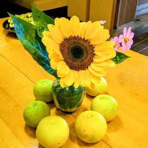 【立派なヒマワリ】 お昼に訪れた飲食店に立派なヒマワリがありました 造花かと思い近付くと 本物でした 2枚目なんて造花にしか見えませんでした お店の方に 「立派なヒマワリですね 写真撮ってもよいですか」 と尋ねると 「お客さんが持ってきてくれたんですよ どうぞ撮ってくさい」 とのお返事 コスモスもカボスもお客さんかな… なんて想像しながら撮りました 秋にヒマワリ🌻 ミスマッチですが なんだか元気になりました