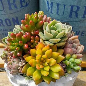 今日はお休み♬*゜ な・の・で…ikuraさんのお楽しみセットに一気に寄せ植え~(๑و•̀ω•́)و!! セメント鉢にはパッカーン気味の桃さん♡ リメ缶にはわさわさになってきたピンクの縁のミセバヤさん♡ サボさん柄の木箱には…やっぱりサボさん🌵笑 またまたお気に入りが増えましたv(。・ω・。)ィェィ♪