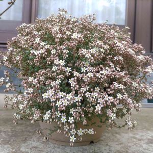どちらも、セダムのダシフィラムですが、 基本種と園芸種では大きさも花の形も、かなり違っています。 大型の方はダシフィラム・バーナティーとかパープルヘイズとか呼ばれ、冬場は紫色になりますが、今は成長期で緑色が濃く、元気モリモリです。