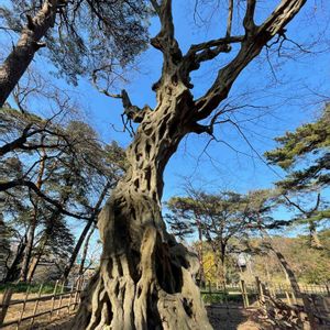 樹齢100年以上の アカシデ(カバノキ科) 日本全土の低地から丘陵地に生育する落葉高木 樹皮は灰白色で滑らかだか、幹は肥大成長が均等に行われない為 凸凹が出来 老木になると太い脈状の出入りが多くなる 名前の由来は花穂の垂れ下がる様子が〆縄の紙(しで)に似て、新芽が赤いことから 床柱や家具に利用される (公園内の解説版より)