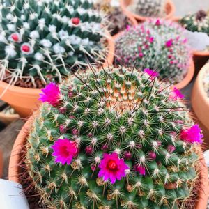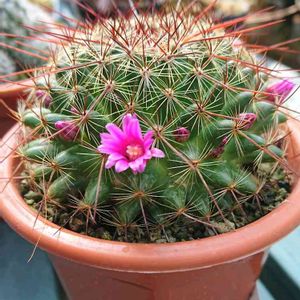 こんにちは✨😃❗ 5月頃🌸咲いたのに蕾着けているみたいです❓😅 鉢増しが必要かな❓😅 マミラリアの大型種らしいです❓😅 銀紗丸🌵