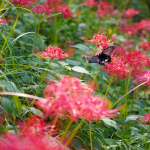 #彼岸花 牧野公園の彼岸花が満開でした。 入り口を少し歩いた所にたくさん咲いています。 黒い蝶と真っ赤なお花が、綺麗ですね〜